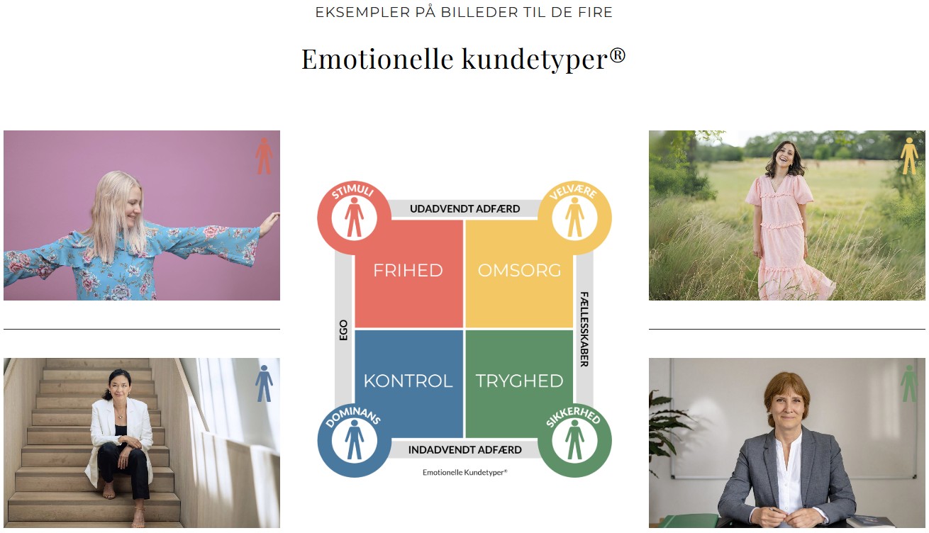 Emotionelle Kundetyper derimod opdeler mennesker i fire psykologiske kundetyper baseret på deres følelsesmæssige drivkraft. Hver type har en unik måde at reagere på visuelle udtryk, kommunikation og markedsføring.